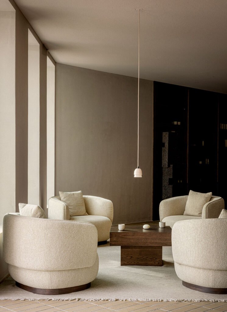 A calm lounge area offers a natural place to pause and settle in. Soft light, muted tones, and generous furnishings create a gentle transition further into the building – an invitation to linger, wait, or simply take a quiet moment.