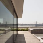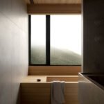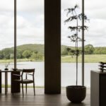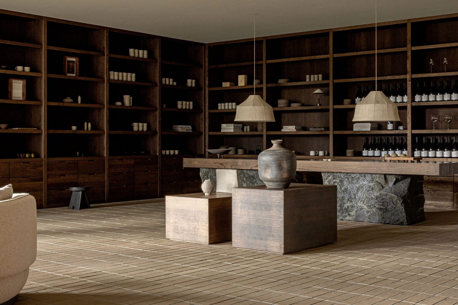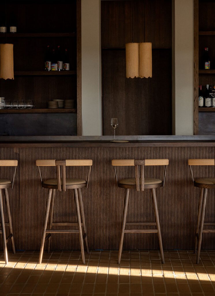 Sculptures of raw stone bring a quiet presence to the interior, nodding both to the surrounding landscape and to Restaurant ÄNG, where similar boulders pay tribute to the terrain. At the bar, bespoke stools crafted with Karimoku Case introduce a warm, tactile expression, while the finely slatted detailing of the counter catches the shifting light. Together, these elements create a calm atmosphere in which nature and craft meet in a subtle, harmonious dialogue.