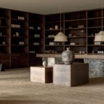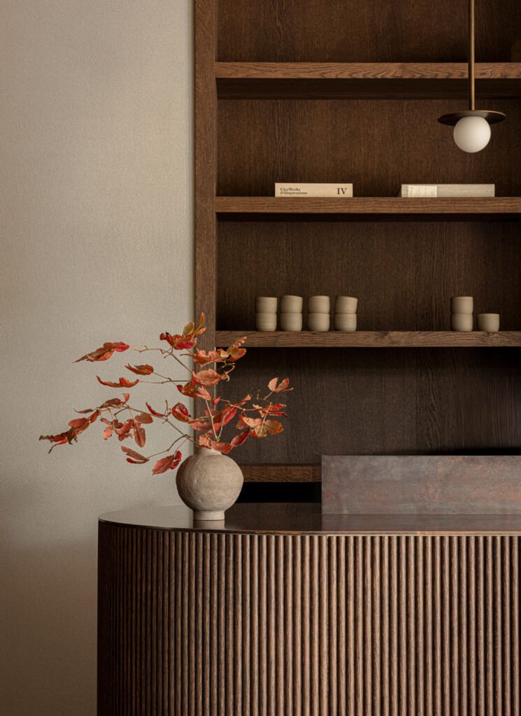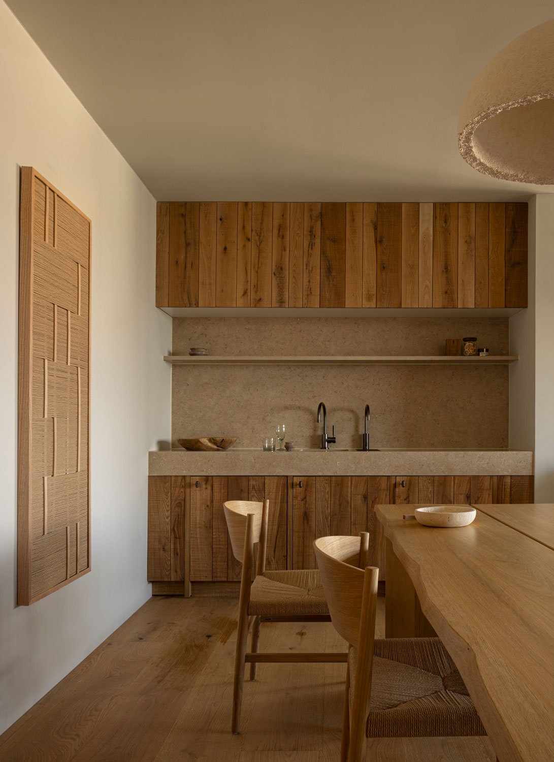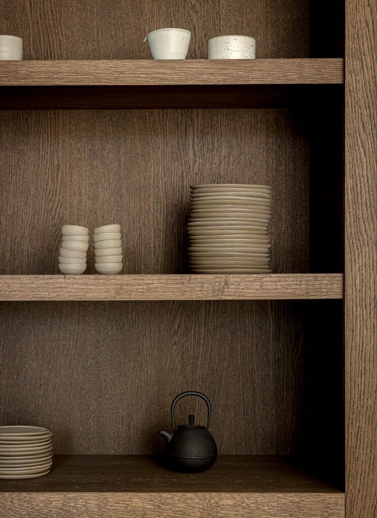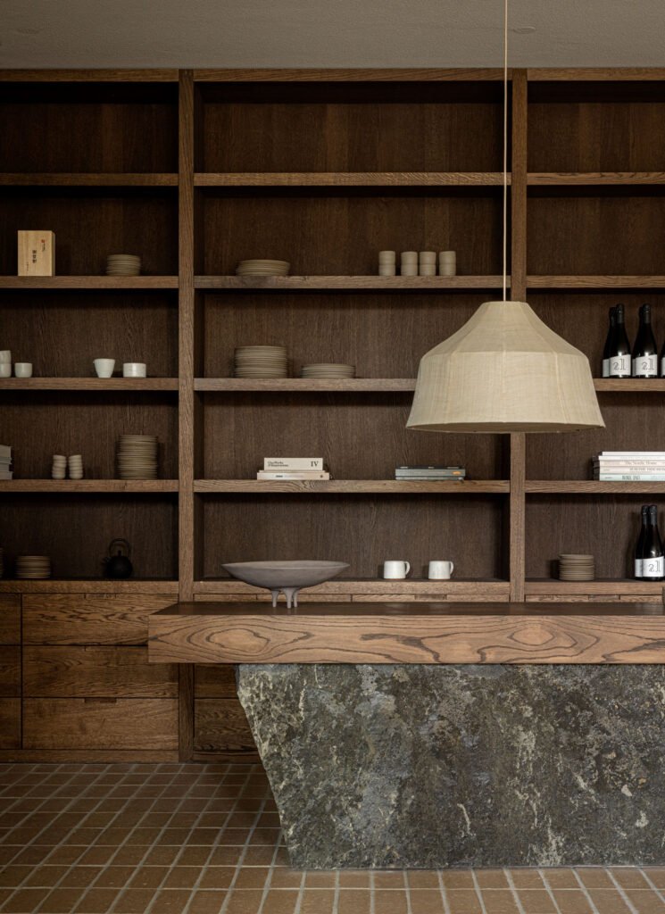 Raw stone, brick, and oak anchor the space with a quiet sense of weight and warmth. Together, they form a serene, understated backdrop that allows each object on display to emerge with simplicity and intention – while the interior itself becomes part of the exhibit, framing and elevating the crafted pieces it holds.