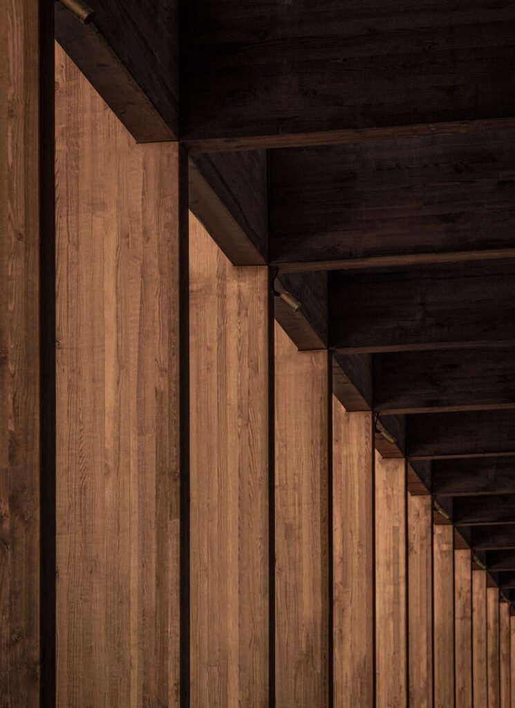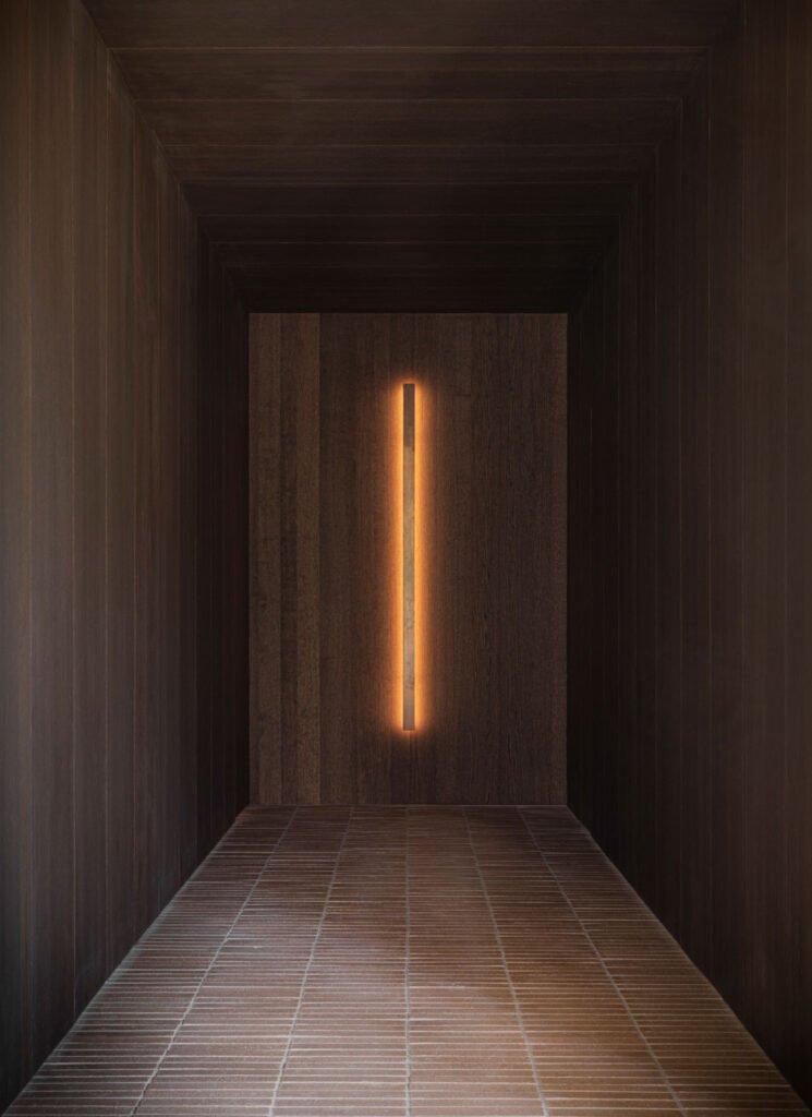 The guest journey is framed through a sequence of considered thresholds. The walkway to the spa wraps guests in dark timber, creating an immediate sense of immersion, preparing the senses for the wellness experience ahead.